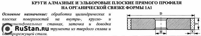 ГОСТ 16167-90 Основное назначение: обработка цилиндрических и плоских поверхностей на внутри-, круго- и плоскошлифовальных станках, заточка и доводка различного режущего инструмента из твердого сплава и быстрорежущей стали. 1А1-круг плоский прямого профиля 150х10х5х32 (DxTxXxH)-диаметр и высота круга, толщина алмазного слоя,посадочный диаметр, мм АС6 160/125-марка и зернистость шлифпорошка из синтетических монокристаллических алмазов 100%-концентрация В2-01-связка органическая 100,0кар.-масса алмазов, карат ГОСТ16167-90