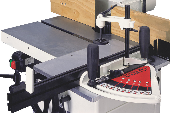 Фрезерный упор имеет усовершенствованную конструкцию с увеличенными накладками из алюминиевого профиля. Для регулировки его сдвигают целиком, ослабив два фиксатора. Винтовой механизм с миллиметровой шкалой позволяет отдельно настраивать положение задней накладки (величиной выступа регулируют глубину съёма). В качестве верхних прижимов заготовки используются пластиковые «гребёнки», в том числе страхующие от обратного выброса.