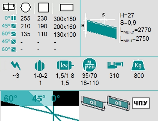 | Наибольший размер отрезаемой заготовки прямоугольного сечения (при угле реза 0 град.), мм. | 300 х 180 |
