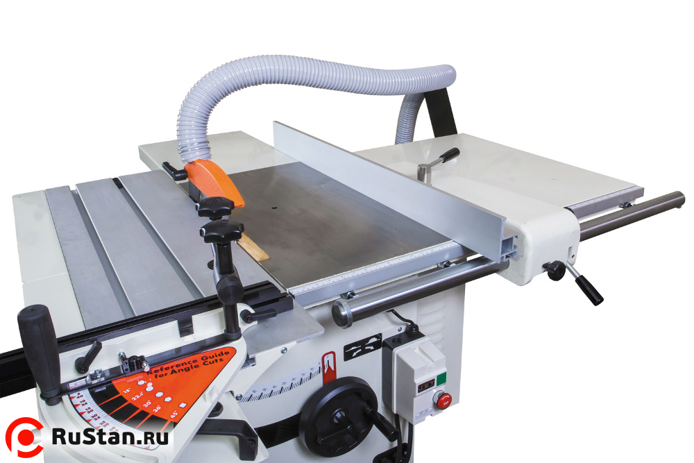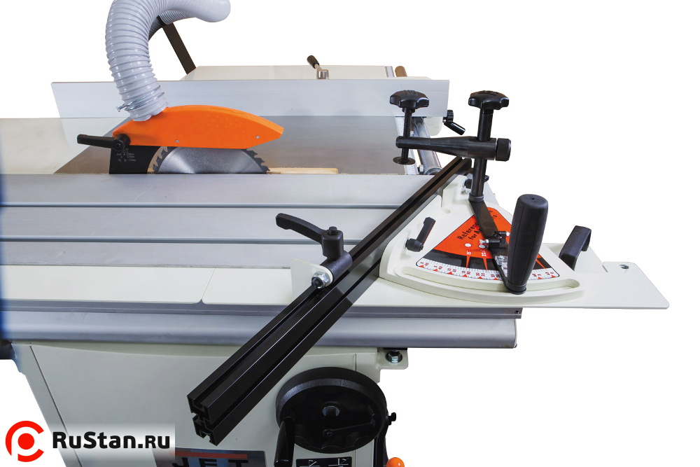 В стандартную комплектацию станка входит небольшой по длине угловой упор с транспортирной шкалой для работы на подвижном столе (каретке) и объединенный с ним винтовой прижим заготовки. Удлинитель и расширитель стола из листовой стали также поставляются «в базе». Для пиления вдоль предусмотрен параллельный упор с эксцентриковой фиксацией, который перемещается вдоль направляющего профиля, длина которого соответствует ширине рабочего стола, укомплектованного расширителем.