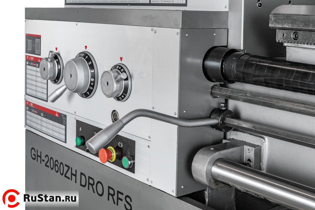 Передняя бабка станка комплектуется электромеханической муфтой, механизм плавного пуска защищает двигатель от пиковых стартовых нагрузок. Привод шпинделя данной модели постоянно находится в масляной ванне, что позволяет решить проблему его смазки, охлаждения и снизить уровень шума. Такой же подход применен и к шестерням передней бабки и коробки подач. На станке можно обрабатывать заготовки на скоростях от 9 до 1600 об/мин, режим 9 об/мин используется для нарезания резьбы плашкой. GH-2060ZH DRO RFS оснащен удобным управлением продольной и поперечной подачей посредством джойстика, предусмотрена возможность ускоренного перемещения суппорта. Для облегчения смены режимов работы предусмотрен толчковый (импульсный) пуск двигателя. Коробка подач станка имеет 80 предустановленных режимов, что позволяет с точностью нарезать метрические, дюймовые, питчевые и модульные резьбы, при этом биение на шпинделе не превышает 9 микрон.