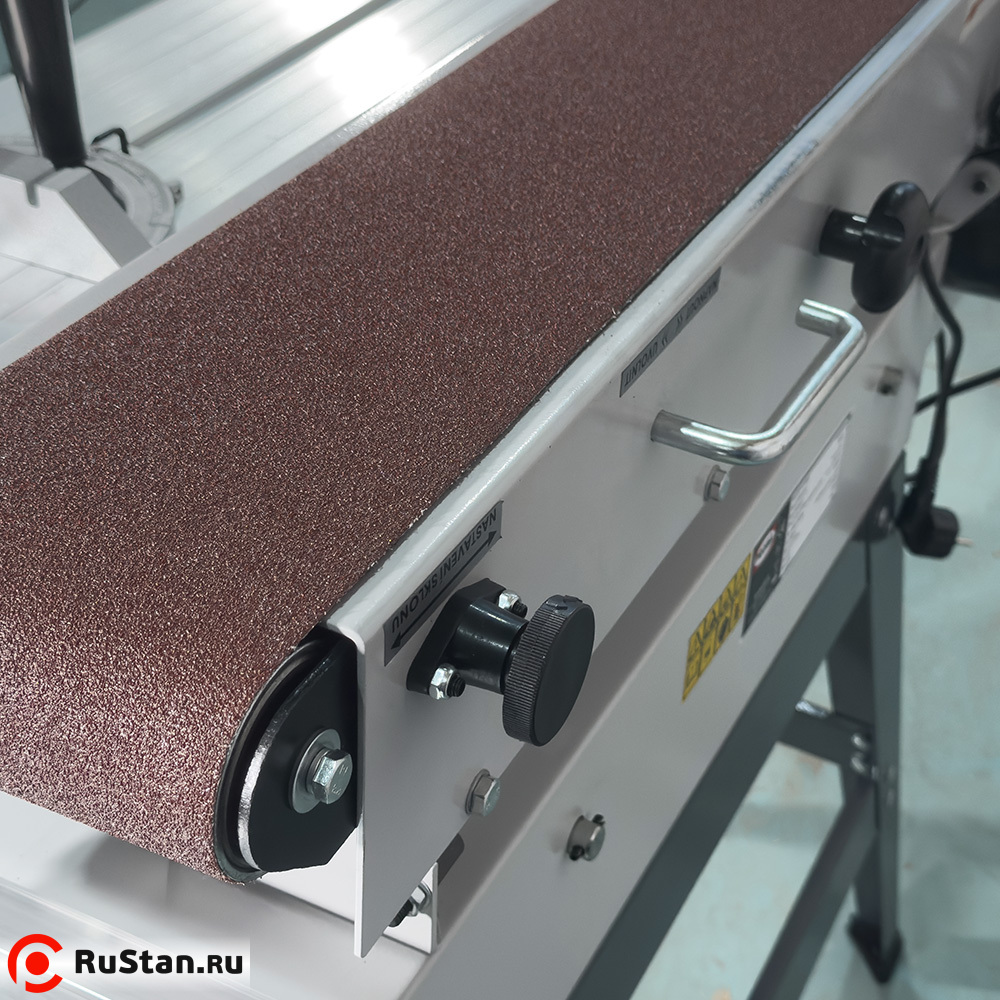Рабочим органом здесь является абразивная бесконечная лента. Посредством ее вращения над столом, на котором размещается заготовка из дерева, производится работа станка. Стол также может двигаться. Ленточный шлифовальный станок обрабатывает заготовки окон, дверей, лестниц, стульев, элементов мягкой мебели и др.